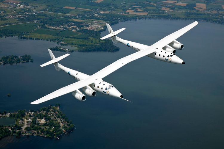 White Knight Two, in flight during the Oshkosh airshow, July 2009. Photo: Mark Greenberg / Virgin Galactic.