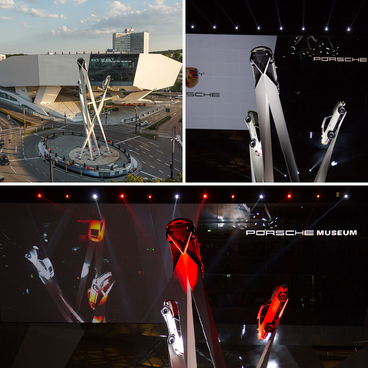 La obra que se acaba de inaugurar consiste en tres pilares que se elevan a una altura de 24 metros y que están coronados por tres Porsche 911 en sus extremos. Son distintas generaciones del 911, que es el modelo deportivo que más admiración causa entre los entusiastas de la marca a lo ancho del mundo: uno de la serie F de 1970, otro de la serie G de 1981, y un exponente de la última generación, la de 2016, en la que destaca el nuevo diseño del alerón retráctil y de los pilotos traseros, junto con la nueva ubicación de los escapes, que se sitúan prácticamente en posición central.