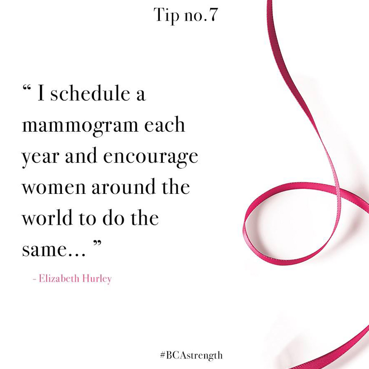 La actriz británica Elizabeth Hurley, portavoz de Estee Lauder y embajadora global de la campaña BCA, también experimentó el dolor de tener a alguien muy cercano con esta enfermedad cuando en 1992 murió su abuela víctima del cáncer de seno. Hurley dijo al respecto: “Estoy convencida de que hay fuerza en la unidad. Juntos podemos actuar para derrotar a esta terrible enfermedad que nos ha afectado a tantas personas”.