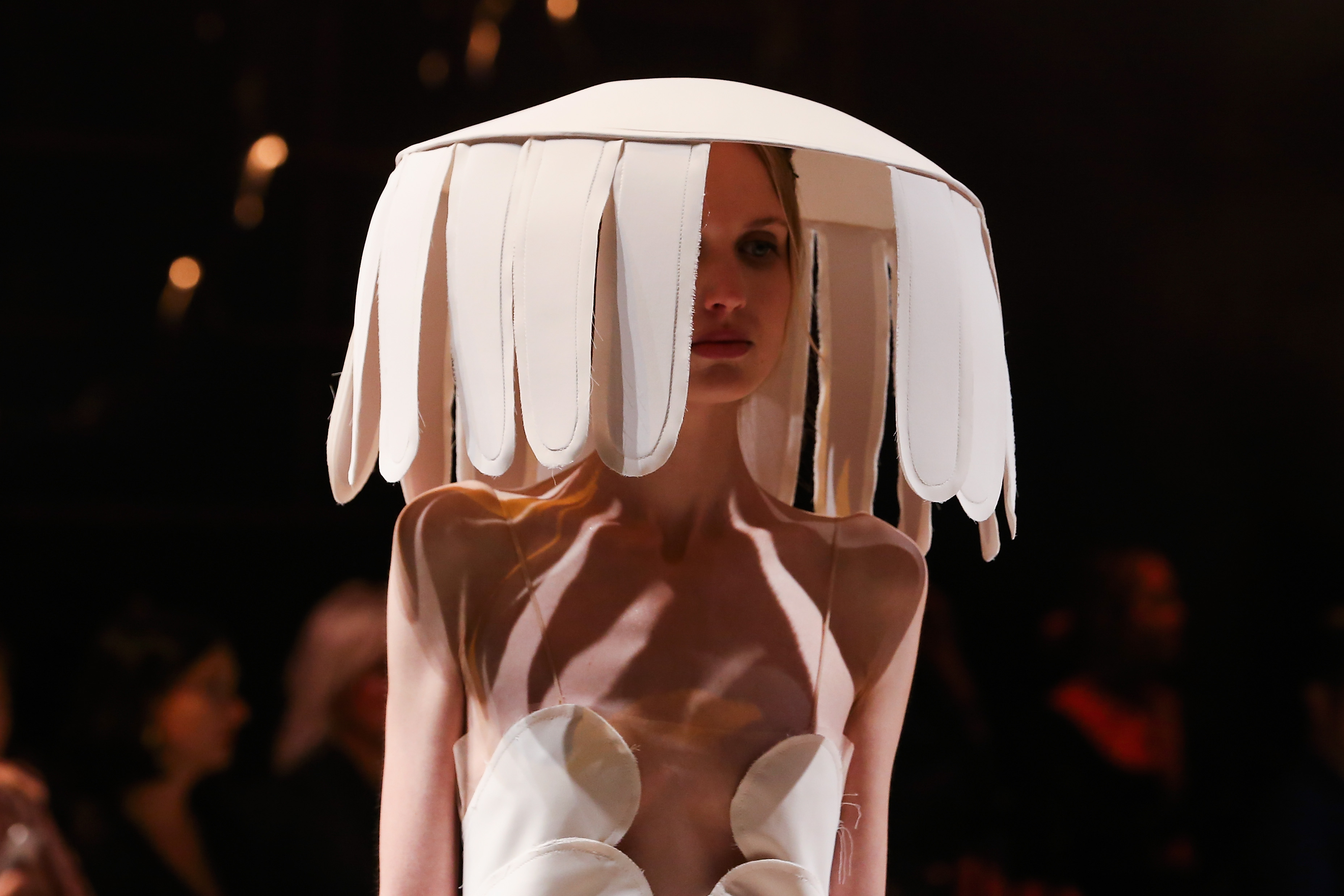 Fiel a la estética de Kavran, la colección es moderna y minimalista. Sin embargo, la diseñadora fue más allá y complementó sus creaciones con impresionantes sombreros que parecían fluir alrededor del cuello.