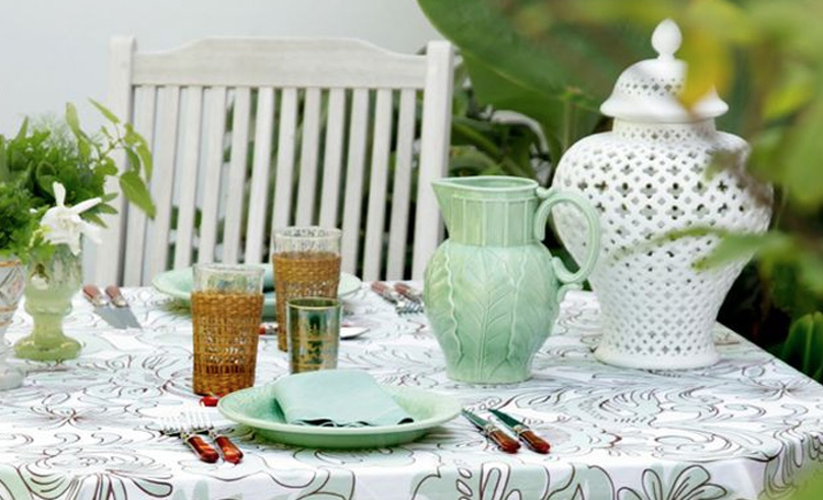 I like to set the table simply when eating outside; it allows the greenery to become the focal point. I need nothing more than a green tablecloth, white plates and simple rattan accessories to set my garden table. My centerpiece is right in front of me—in the herb garden. I cut a generous bunch of mixed herbs and place them in a vase.