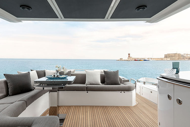 The largest of Azimut’s models debuting at Cannes is the Azimut Grande 32 Metri. For this vessel, the ship maker set out to design a yacht with large, bright spaces. For example, the main deck measures an impressive 753 square feet. Passengers will be able to enjoy several open air areas here, including a dinning area, a sitting area, and a solarium with a jacuzzi on the bow.